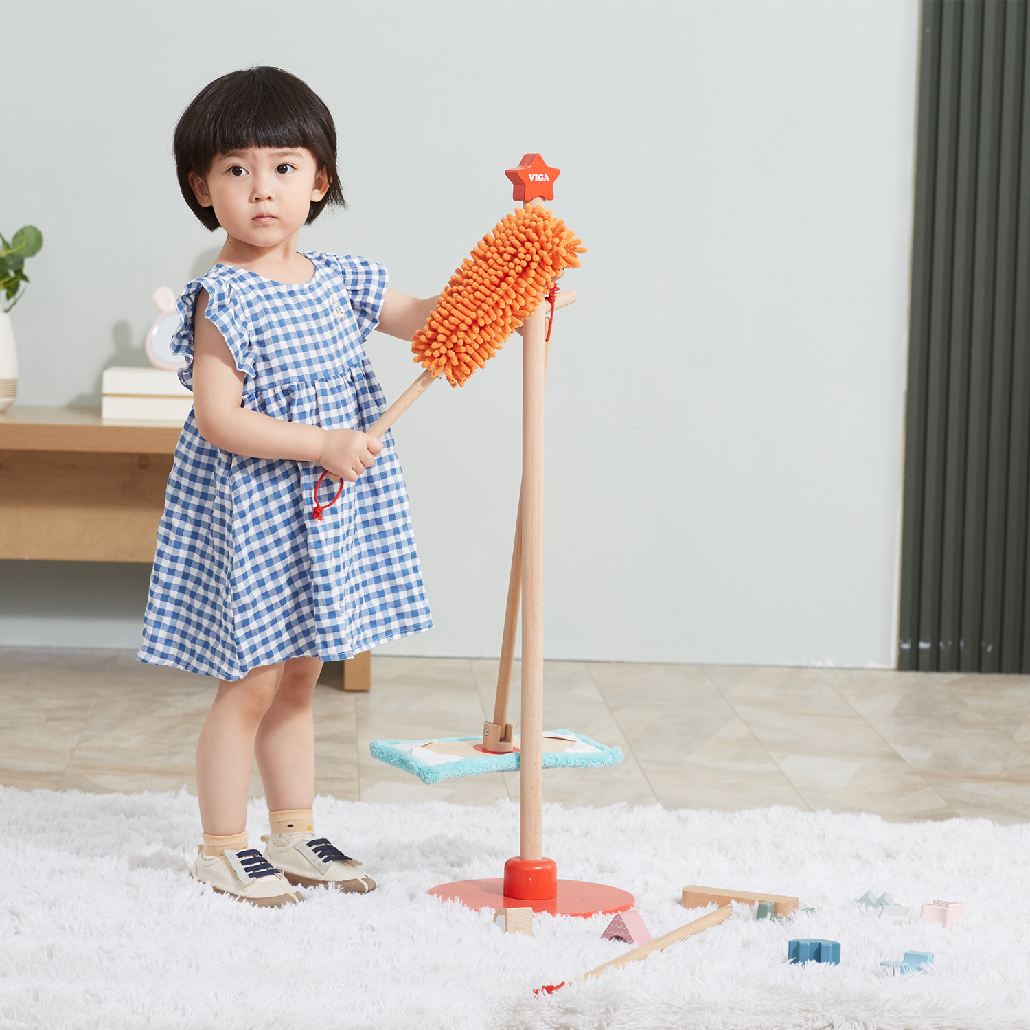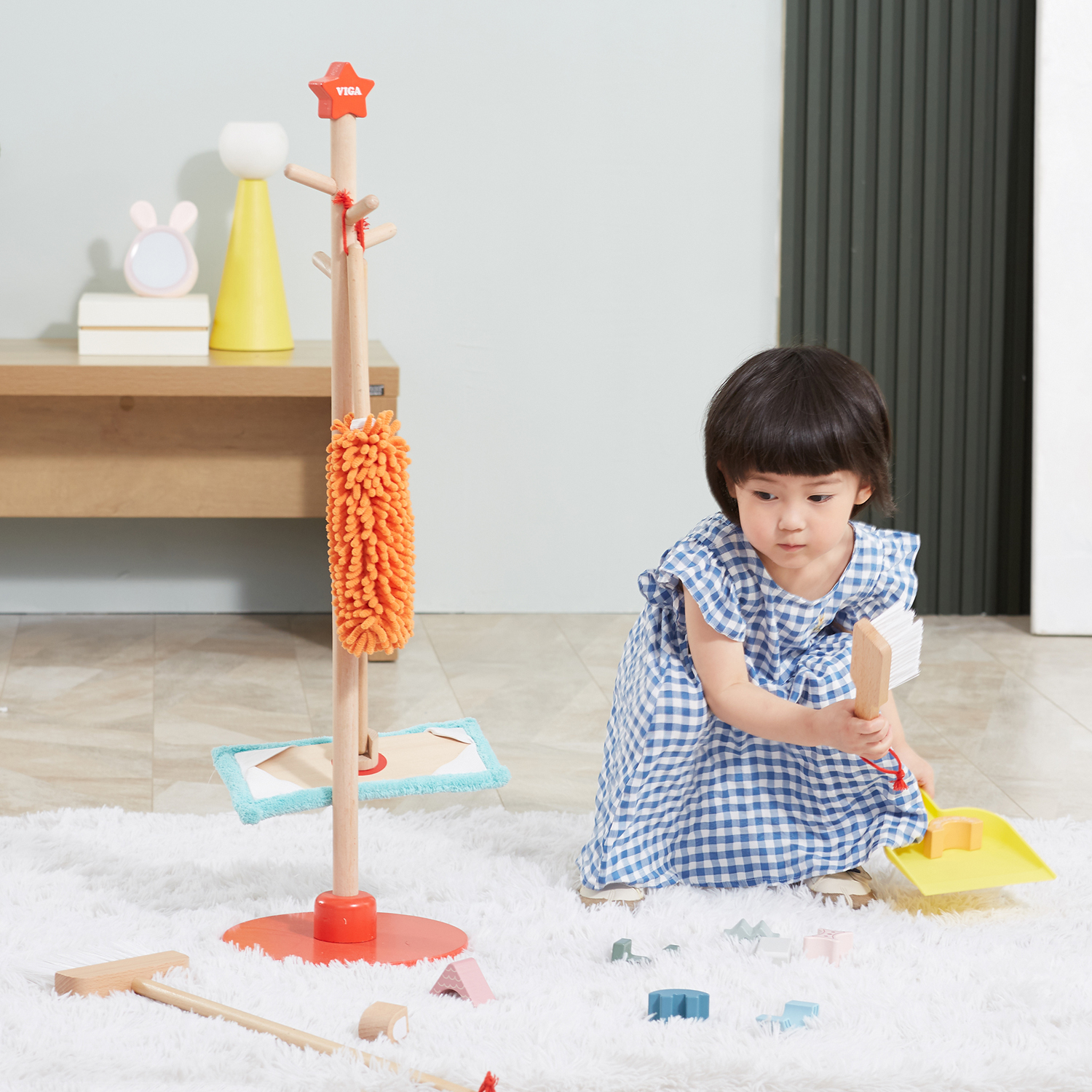 Have fun teaching children how to tidy up and clean with this traditional wooden toy.