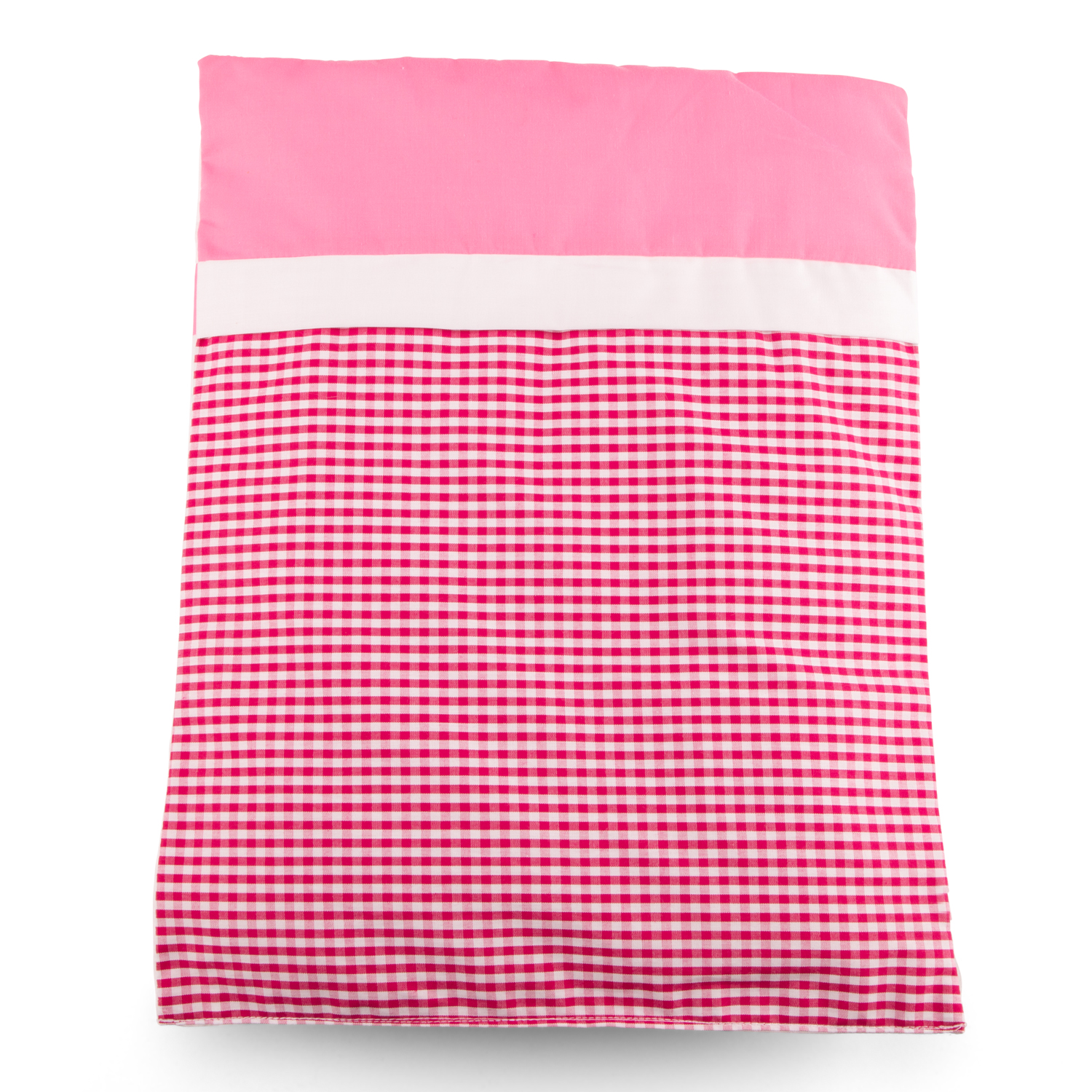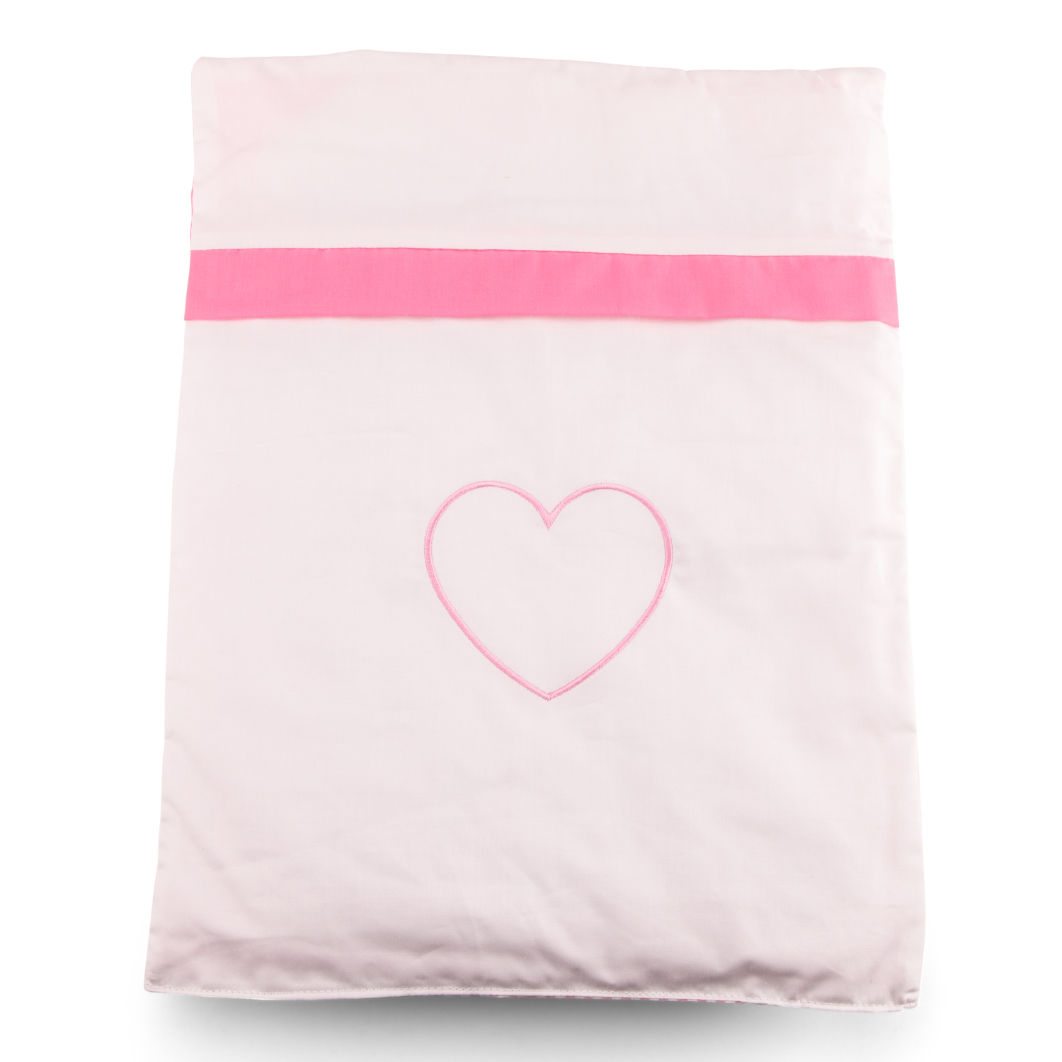 The duvet and pillow are reversible and have a different design on both sides. One side has cute pink with white checkered pattern and the other side a beautiful embroidered heart.