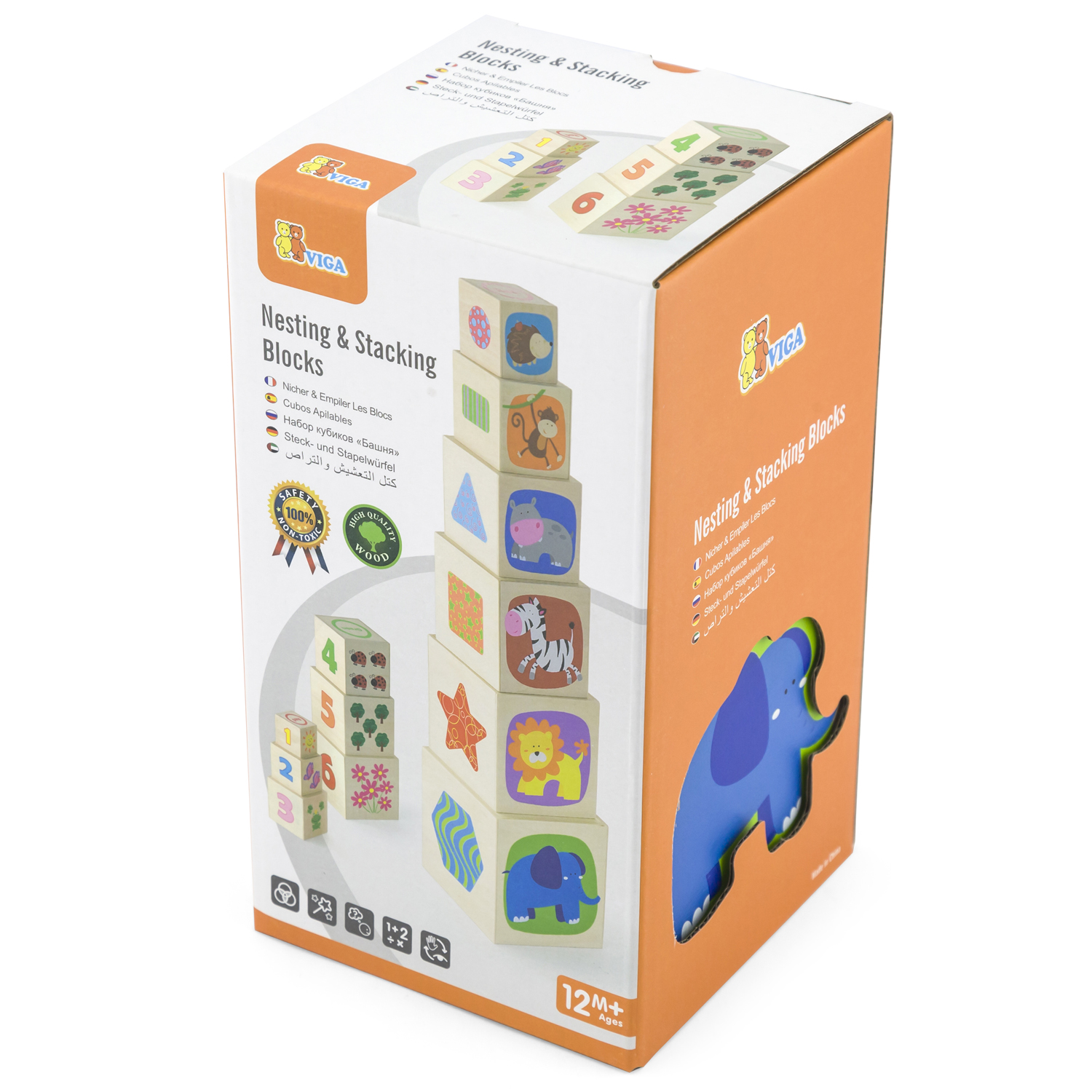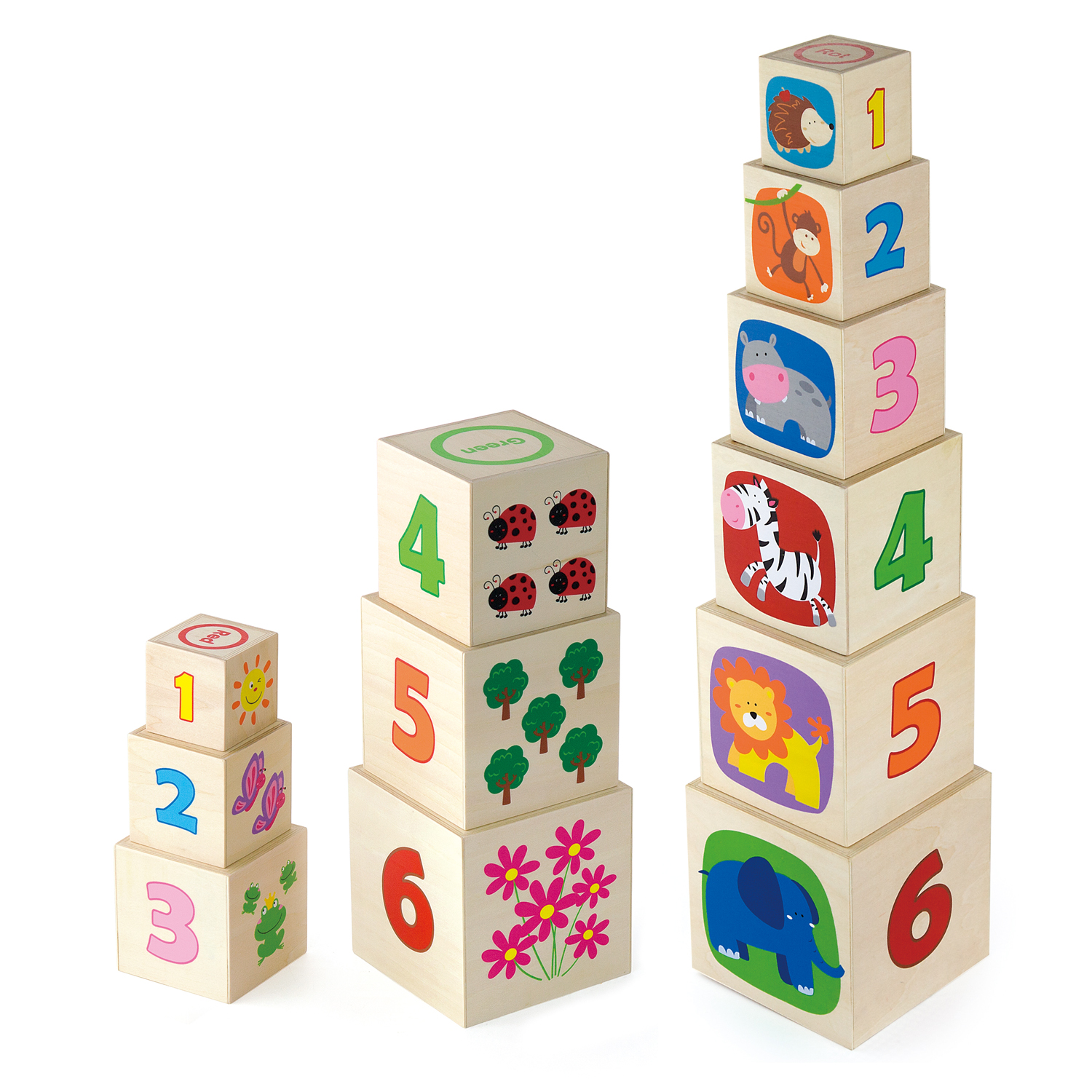-Children are introduced with numbers, shapes, colors, sizes and animals while playing with nesting and stacking.