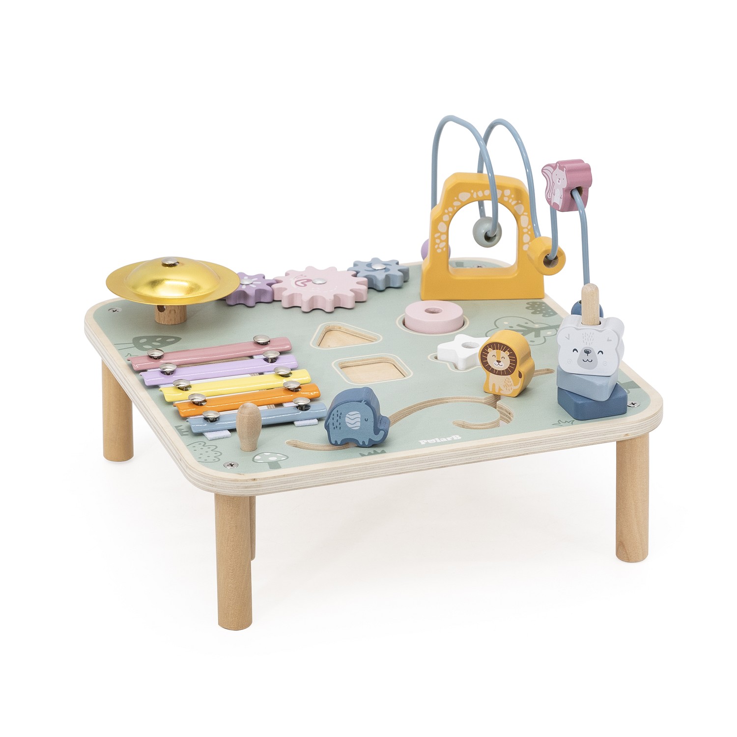 There’s so much to discover with this beautiful wooden activity table from PolarB®! It features multiple play functions, including a bead maze, spinning gears, sliding track, shape sorter, stacking game and a metal xylophone with a gong for exploring musical sounds.