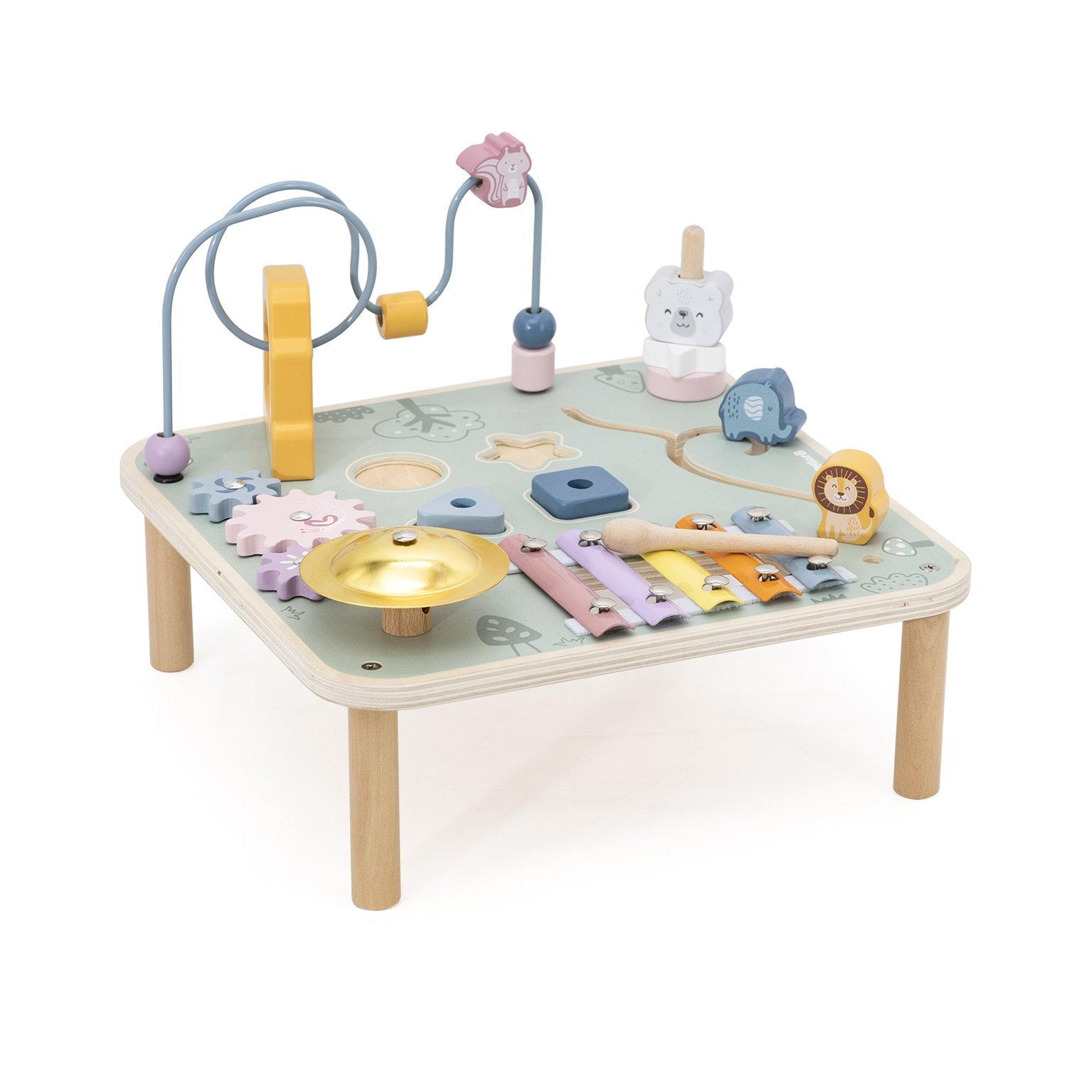 Includes: wooden activity table with bead maze, gears, shape sorter, sliding track, stacking game, metal xylophone, gong and wooden mallet