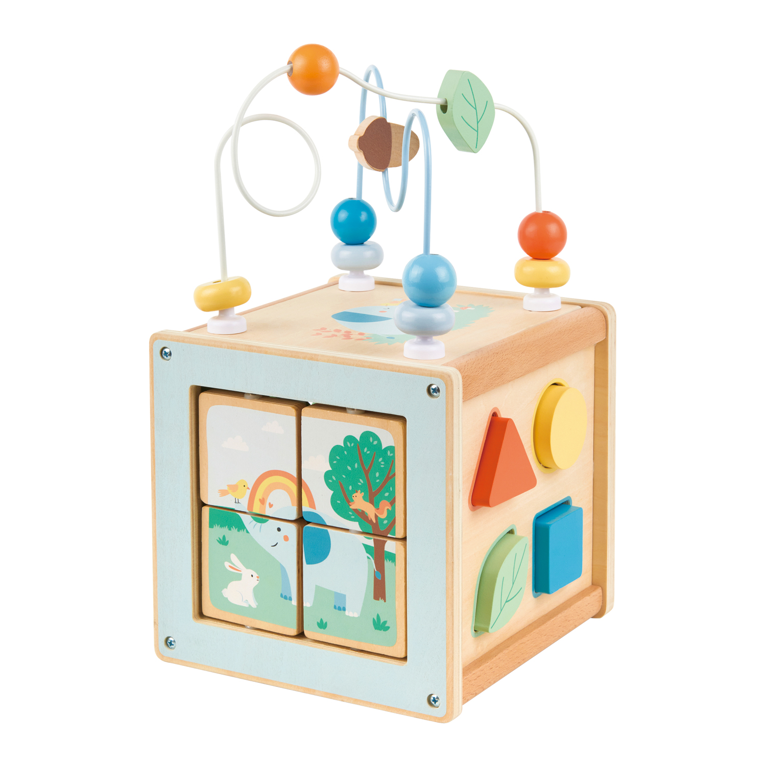 This beautifully designed wooden toy activity cube from Lelin® offers five sides of fun and learning for curious little hands. It features a bead maze, spinning gears, flip puzzles, sliding animals and shape sorting blocks, all made in soft modern colours.