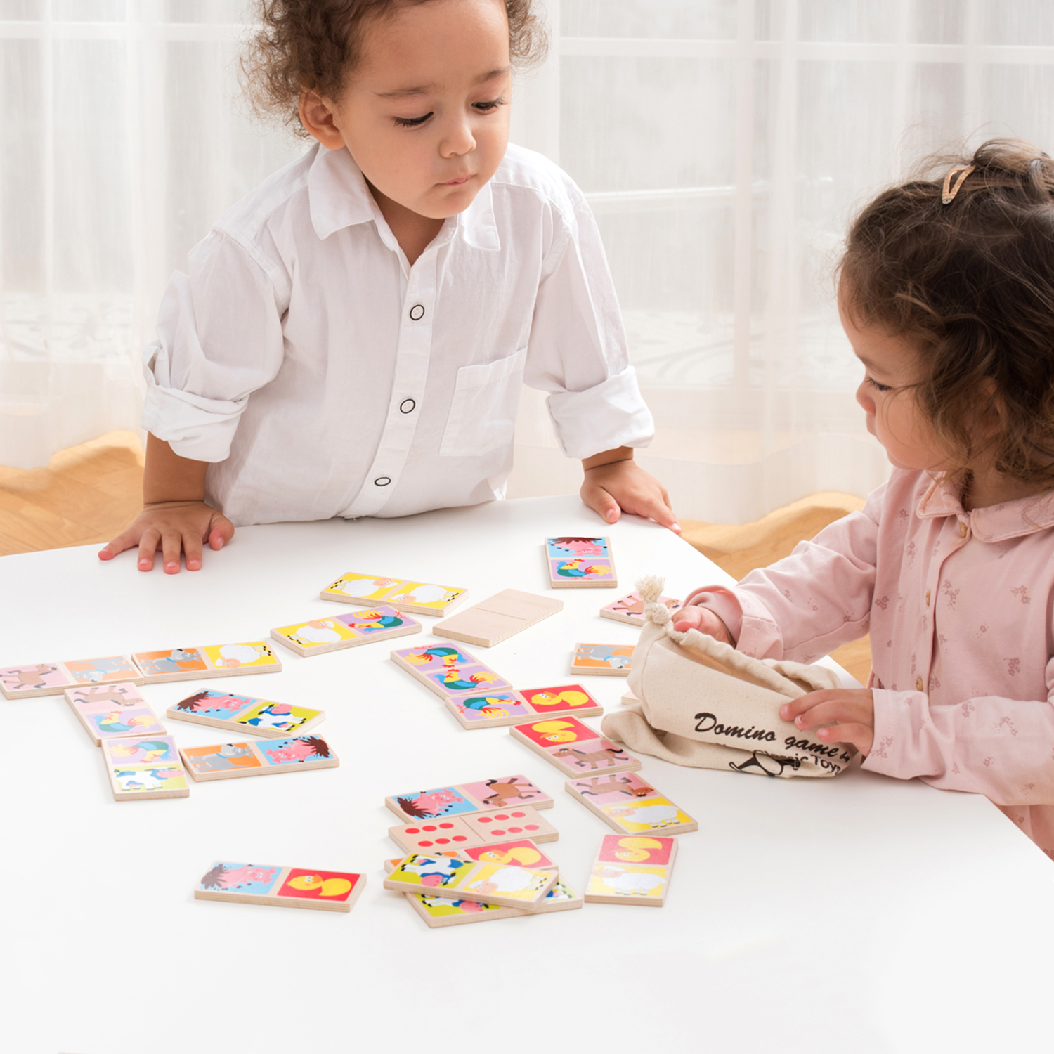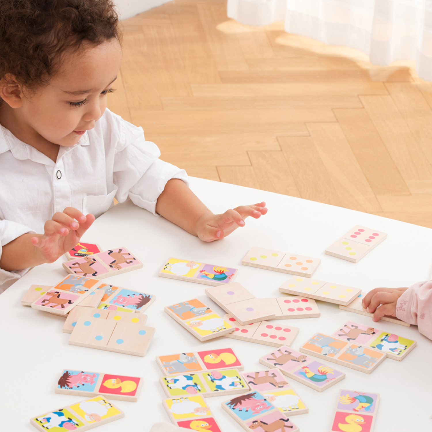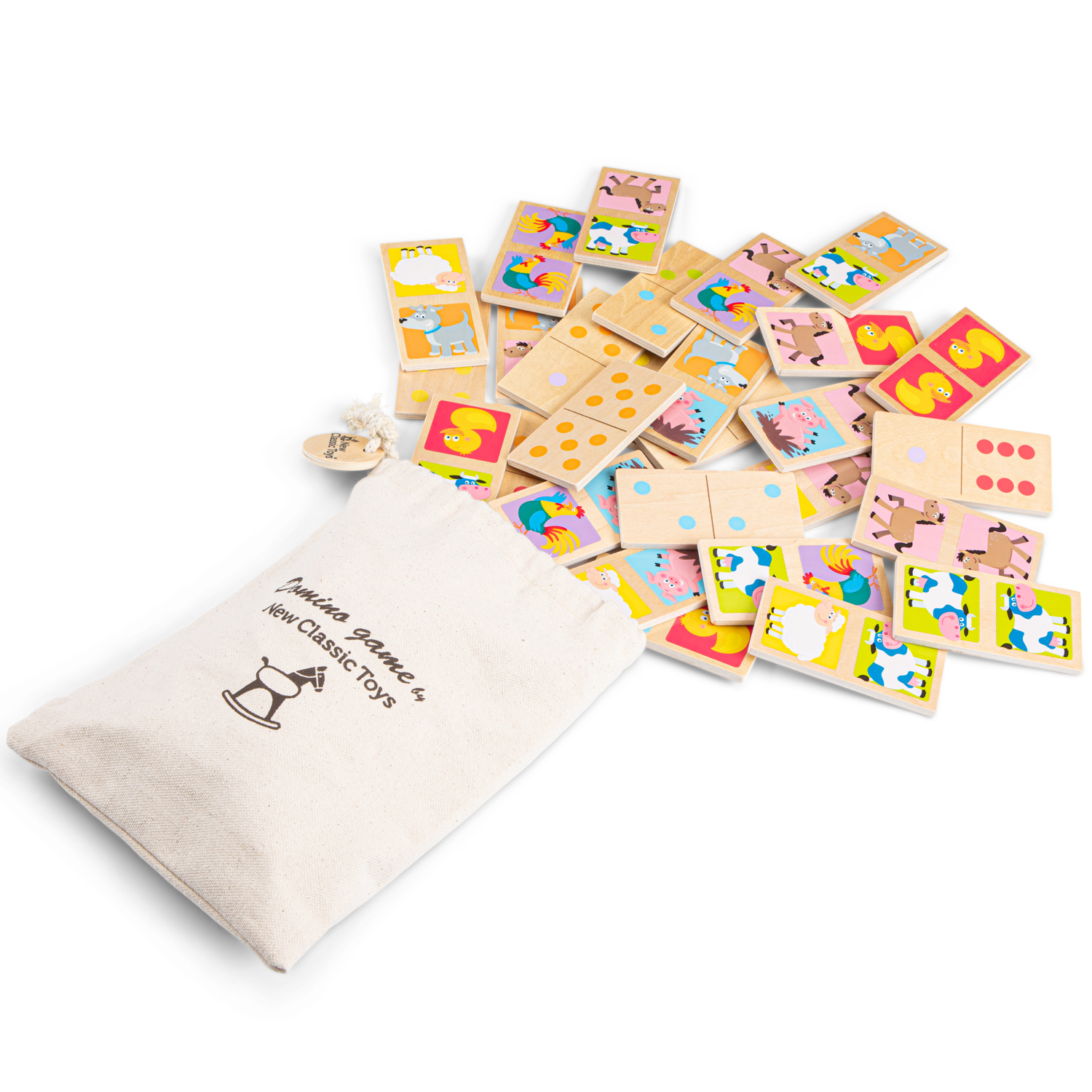 This wooden domino game by New Classic Toys is a perfect game for little ones. It has 28 double-sided dominoes featuring friendly farmyard animals on one side and dots on the other side. Playing this game is an excellent activity for developing fine motor skills, problem-solving abilities and training your logical thinking. Encourages social play while little ones develop recognition and speech skills. Game rules: put all the dominos face-down on the table and mix them up. Each player takes 6 dominoes, if there are more than 3 players each player should only take 3. Don't let the other players see your dominoes! Players take turns to match to match the domino pieces. The winner is the first player that gets rid of all their dominoes. Comes with a cotton bag for easy storage. This domino game is made of FSC® 100%-certified wood.
