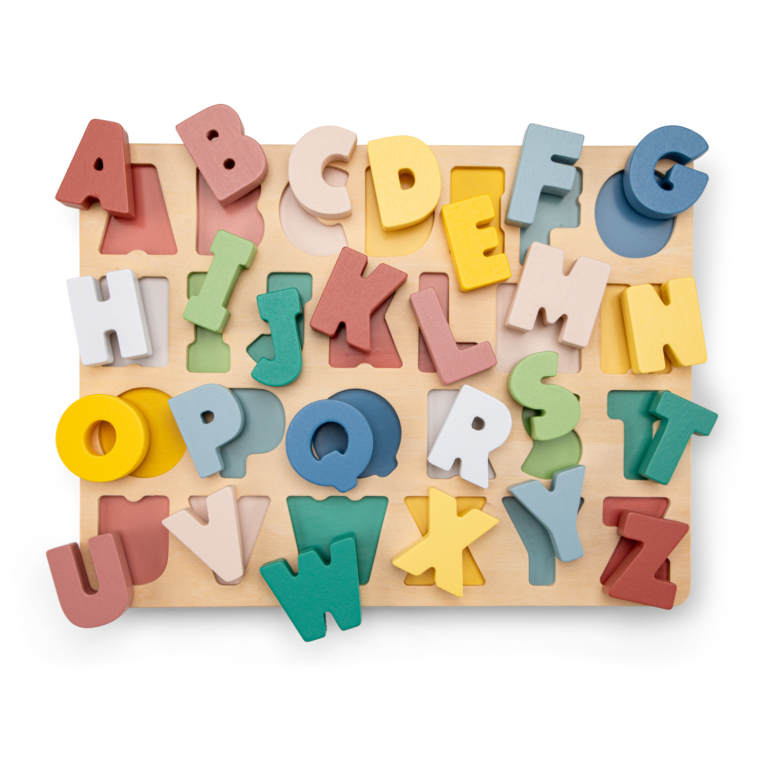 This educational toy is designed to enhance your child's cognitive development and fine motor skills. This puzzel features a sturdy wooden board with 26 colorful, chunky letters designed for little hands. Each letter fits into its corresponding slot, making it easy for children to match and learn the shapes and sounds of the alphabet.