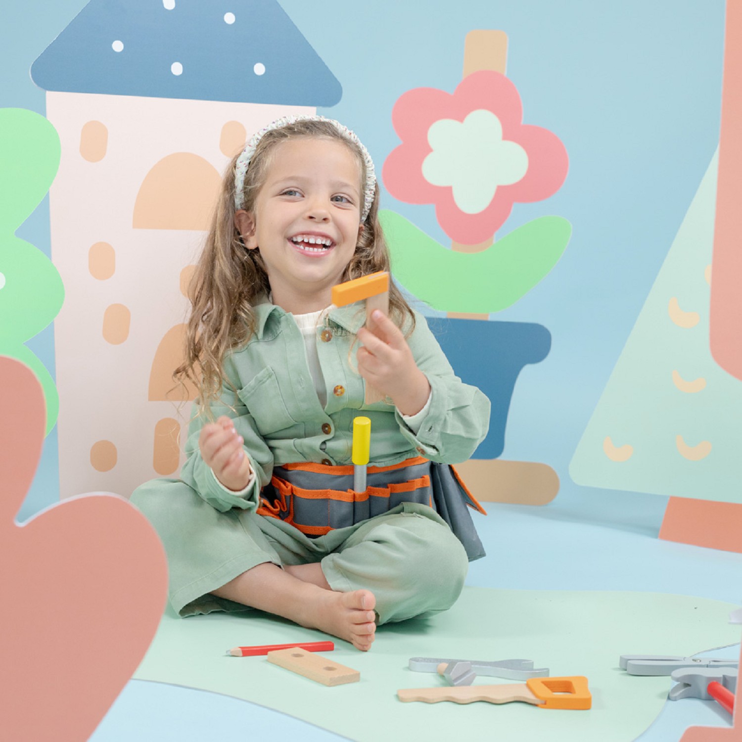 This tool belt set by New Classic Toys has all the tools your little fixer-upper needs for construction play. Featuring a hammer, a pretend pencil, a saw, a screwdriver, pliers, a wrench, a ruler, two bolts, two nuts and two hole wood blocks. All pretend tools fit perfectly in convenient storage slots of the fabric tool belt making it the perfect role play toy for little ones. This set helps teaching sorting and is perfect for developing problem-solving and logical thinking skills. It also encourages fine motor skills, hand-eye coordination and imaginative play. The fabric tool belt is adjustable. Made from FSC® 100% certified wood.