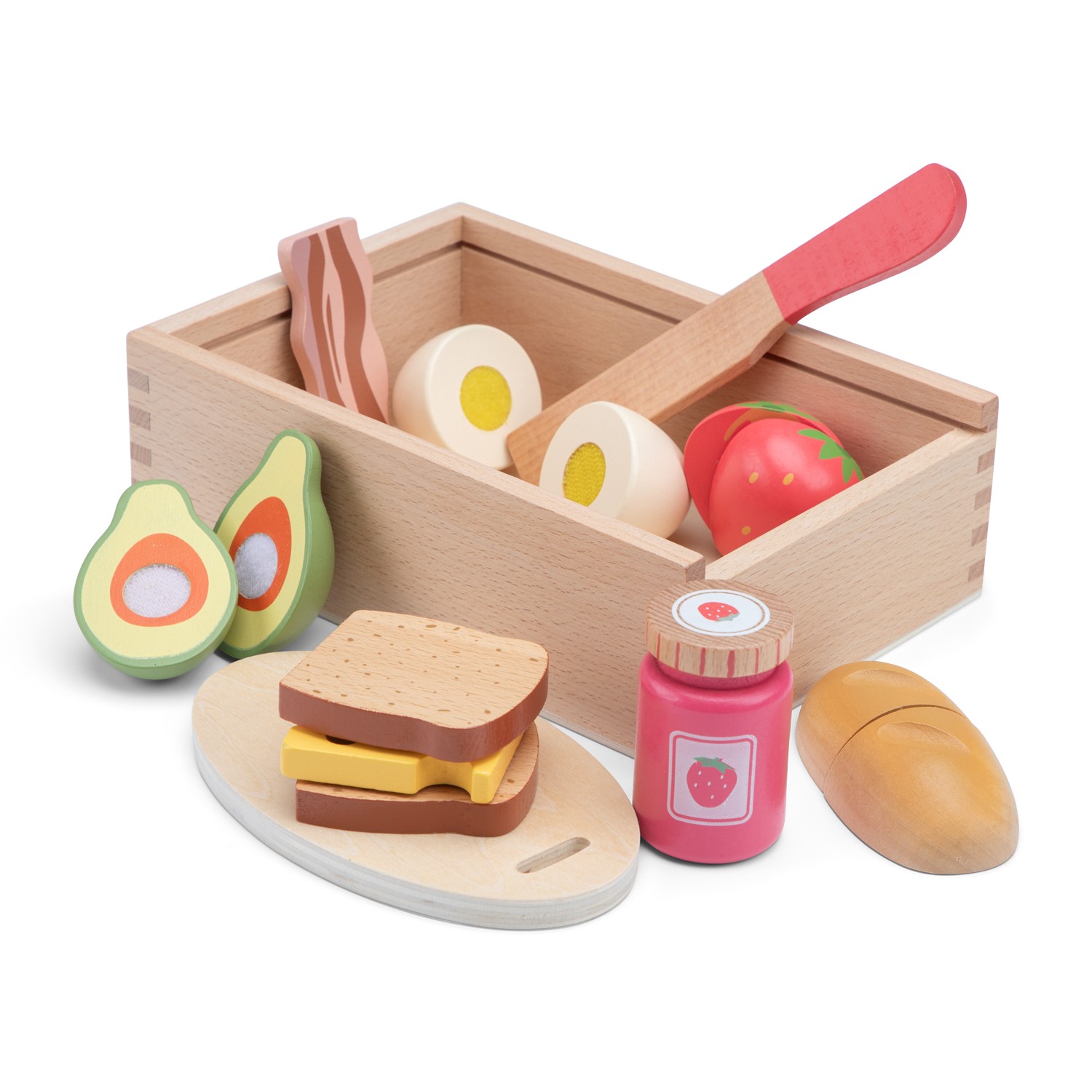 Comes with a wooden box with acrylic sliding lid for cleaning up and storage. This article is part of the New Classic Toys "Bon Appetit" productline. Cutting, baking, cooking and ready for dinner! Our little pots, pans, cuttings sets and kitchens are absolute must haves for little master chefs.