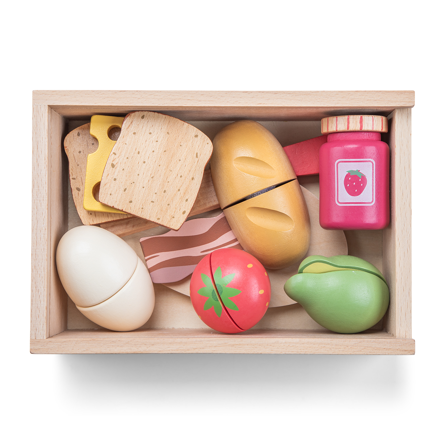 This wooden cutting meal from New Classic Toys is great for teaching young children about different types of foods. Your child will enjoy exploring the various shapes and colors as they prepare a delicious meal. This set comes with a cutting board and a pretend knife to chop the fruits in half, then once you little one has finished cooking, the pieces can be put back together with the velcro fastening. Great for creativity and role playing. This breakfast set contains: