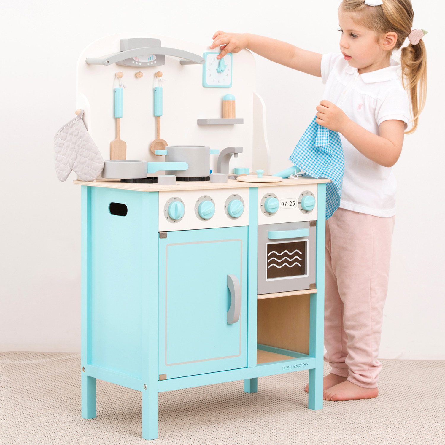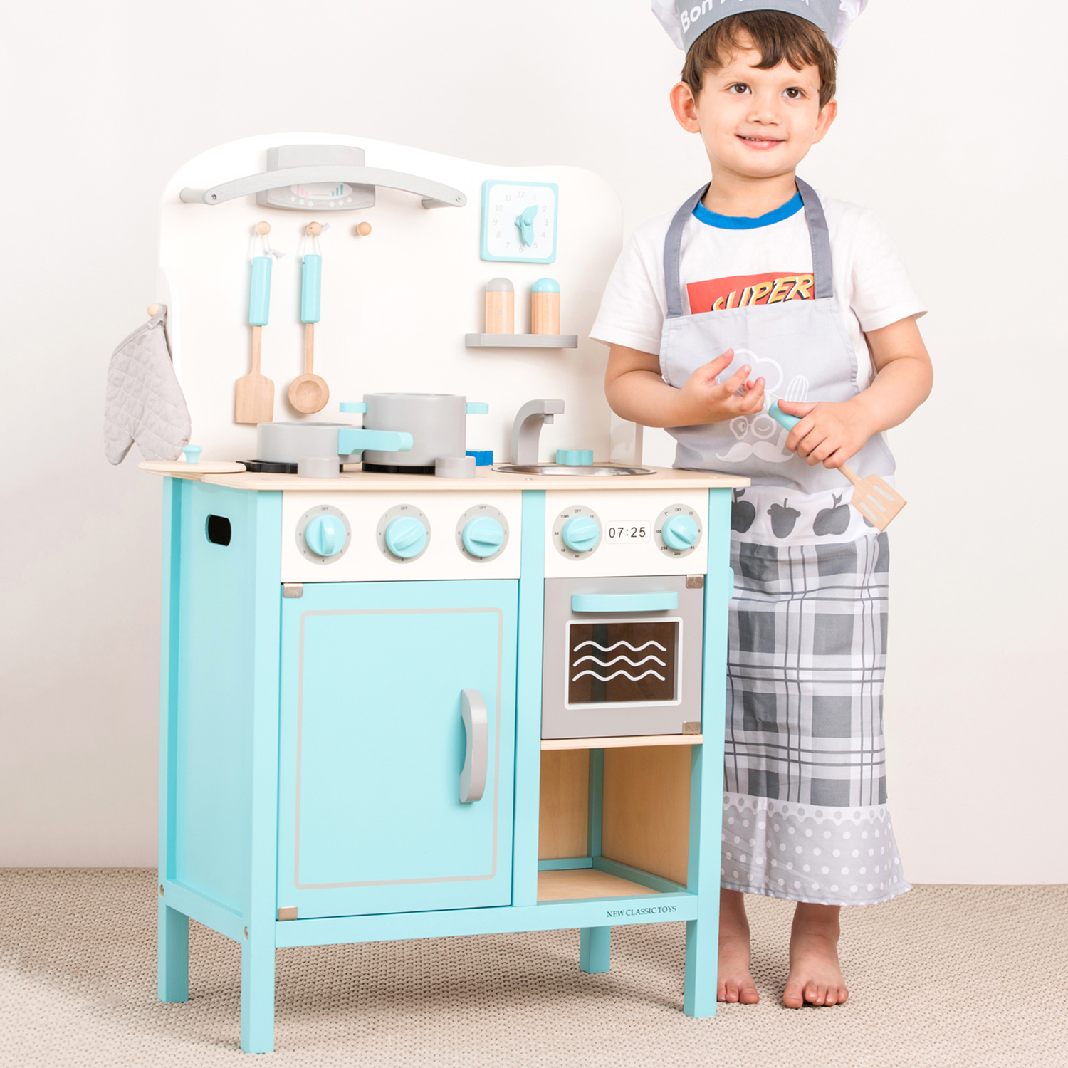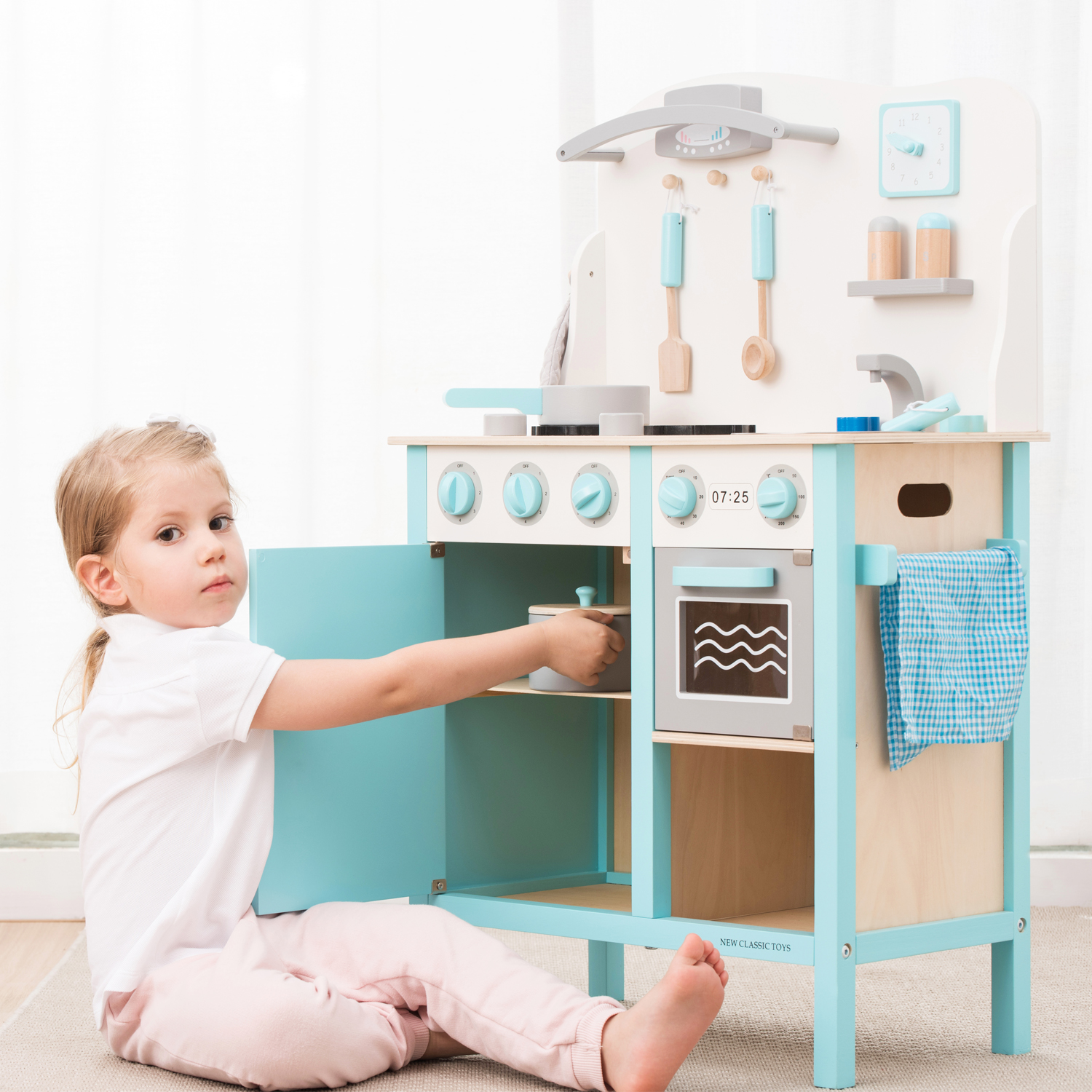 A little chef's dream kitchen from New Classic Toys for preparing and cooking playfood. Little chefs will love cooking up meals for the whole family with the adorable bon appetit kitchen. Children can use their imaginations to create menus. This kitchen is perfect for playtime as your child and their friends can cook together, promoting strong social skills. It has everything a little chef needs. With a removable sink, two-burner cooktop, see-through door oven, storage shelves and a clock with movable hands, This kitchen has the perfect ingredients for hours of pretend-play fun!