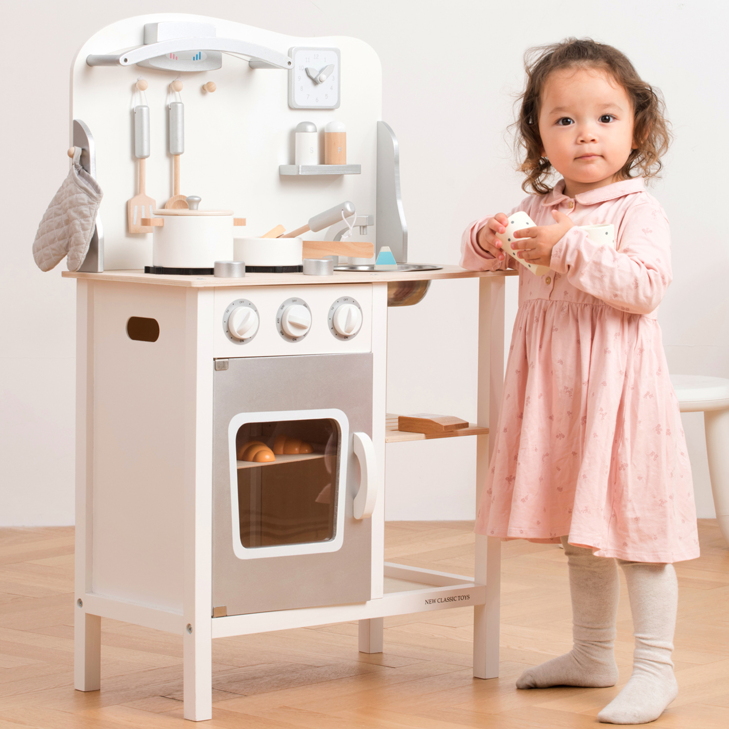 This beautiful kitchen is part of the New Classic Toys "Bon Appetit" productline. Cutting, baking, cooking and ready for dinner! Our little pots, pans, cuttings sets and kitchens are absolute must haves for little master chefs.
