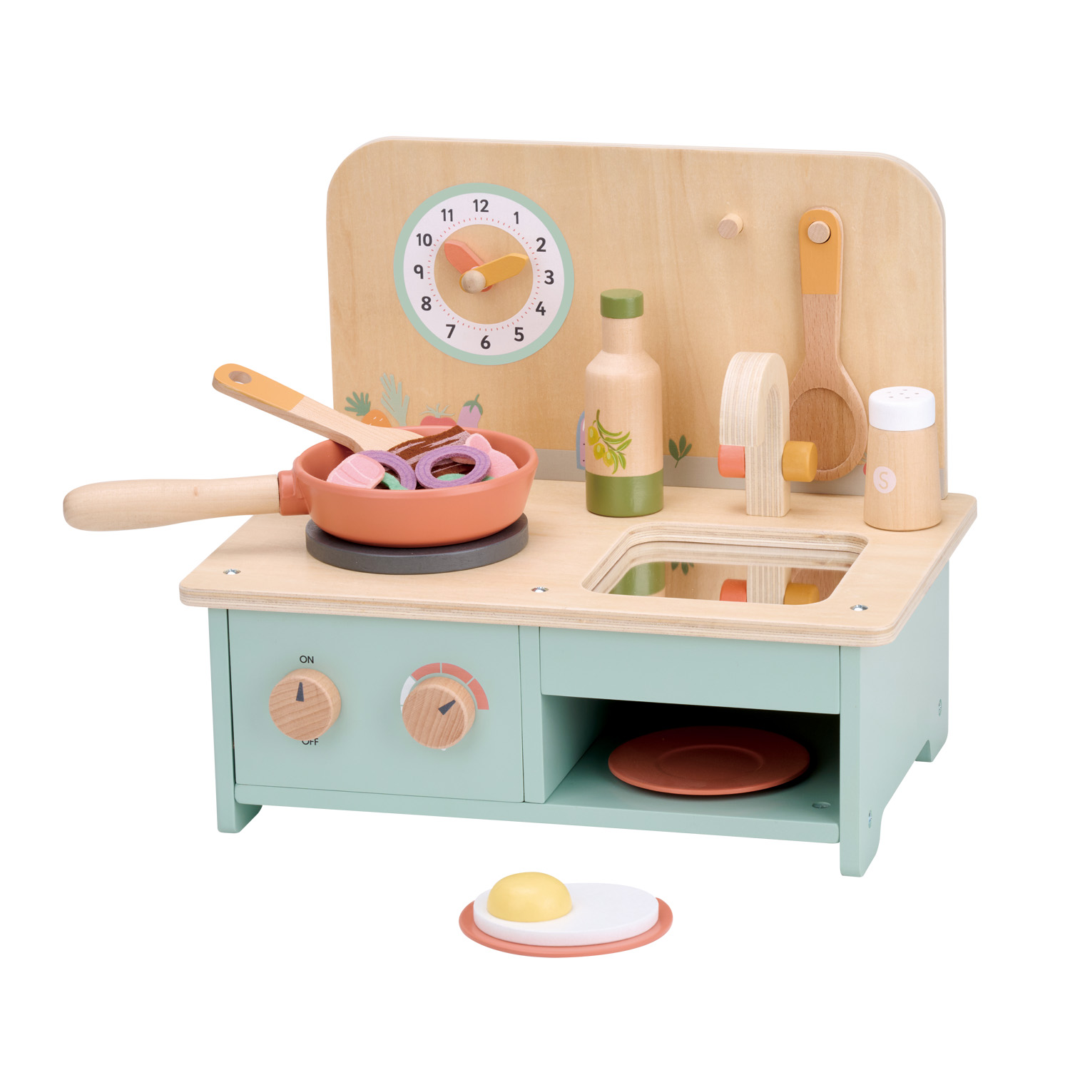 This charming wooden toy kitchen from Lelin® is designed for imaginative cooking play. The compact tabletop design features a sink, stovetop, turning knobs, and a wall clock for keeping track of cooking time. The set also includes realistic accessories such as a frying pan with food pieces, a olive oil bottle, 2 utensils, and a peper shaker.
