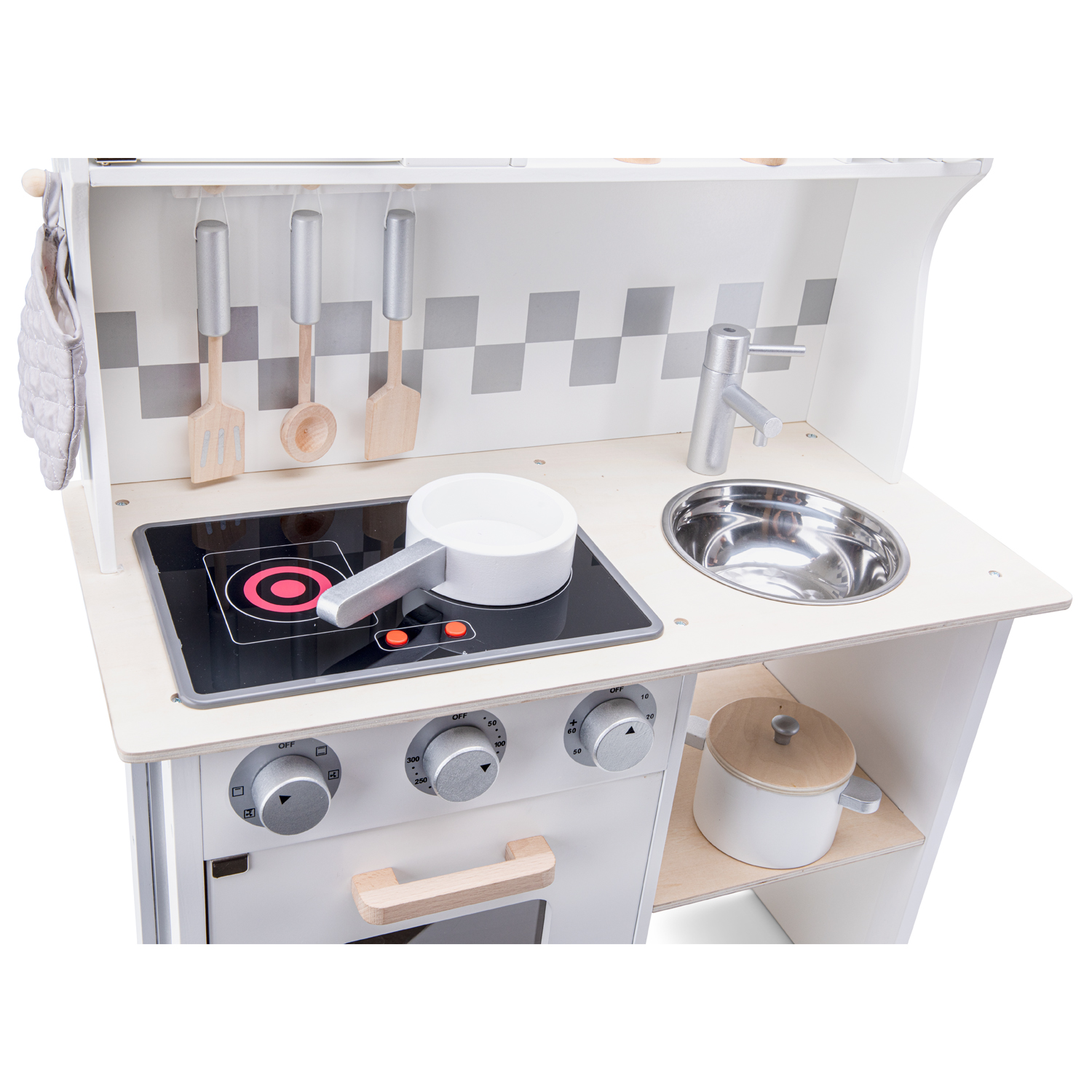 This beautiful kitchen is part of the New Classic Toys "Bon Appetit" productline. Cutting, baking, cooking and ready for dinner! Our little pots, pans, cuttings sets and kitchens are absolute must haves for little master chefs.