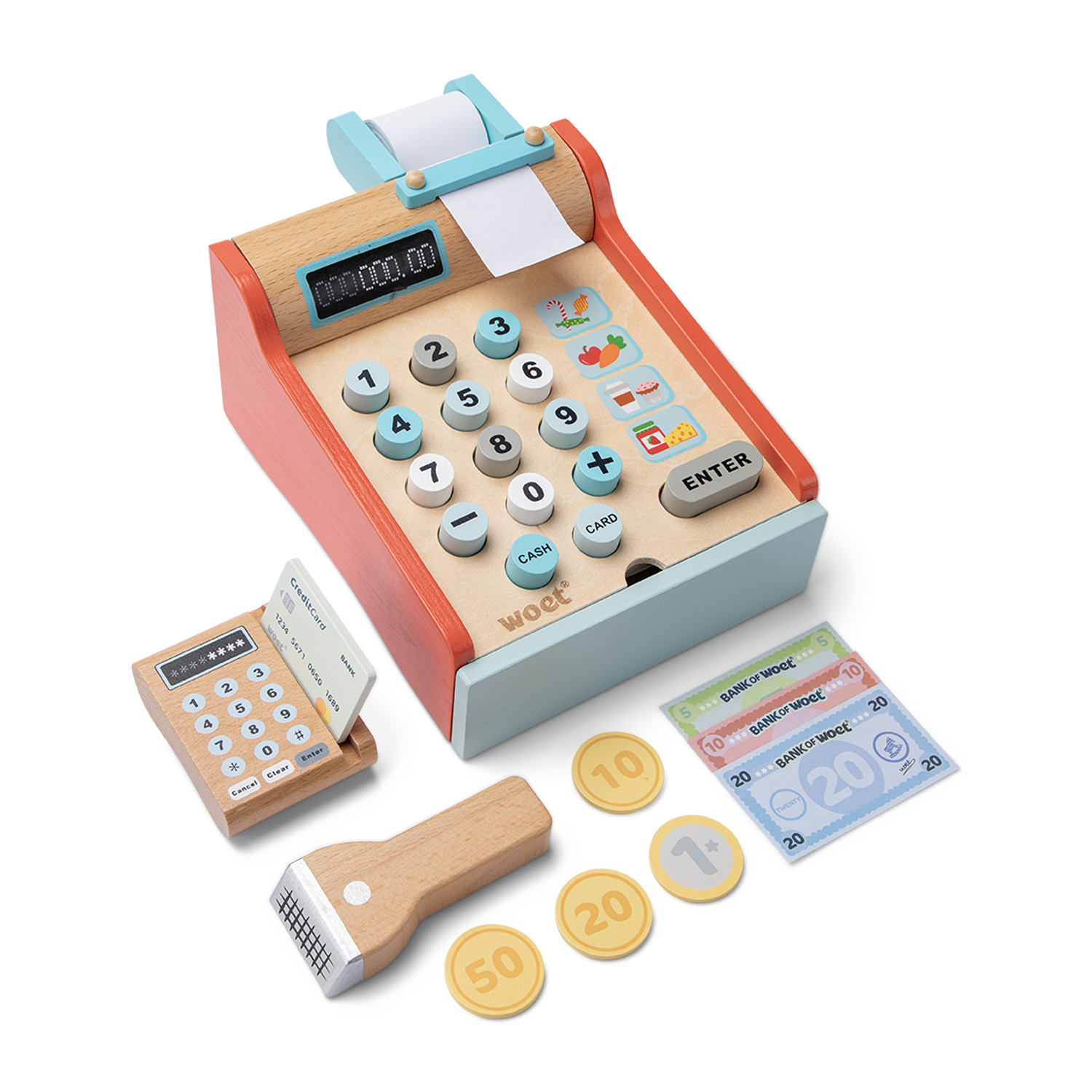 Open your first store with this wooden cash register from New Classic Toys. "Cha-ching"! Little ones will love learning early math and reasoning skills when it is combined with fun. Will you be paying with cash or card today? And who's next in line? Playing with this cash register is a great way for children to develop social and speech skills as they run their very own store. It also inspires imaginative play and allows storytelling skills to flourish. Role playing is an effective way for children to make sense of the world around them. This cash register comes equipped with a drawer that you can take out, a scanner, a card reader, a till roll and 30 pieces of play money, 8 wooden coins and a credit card. This cash register is made of FSC® 100%-certified wood.
