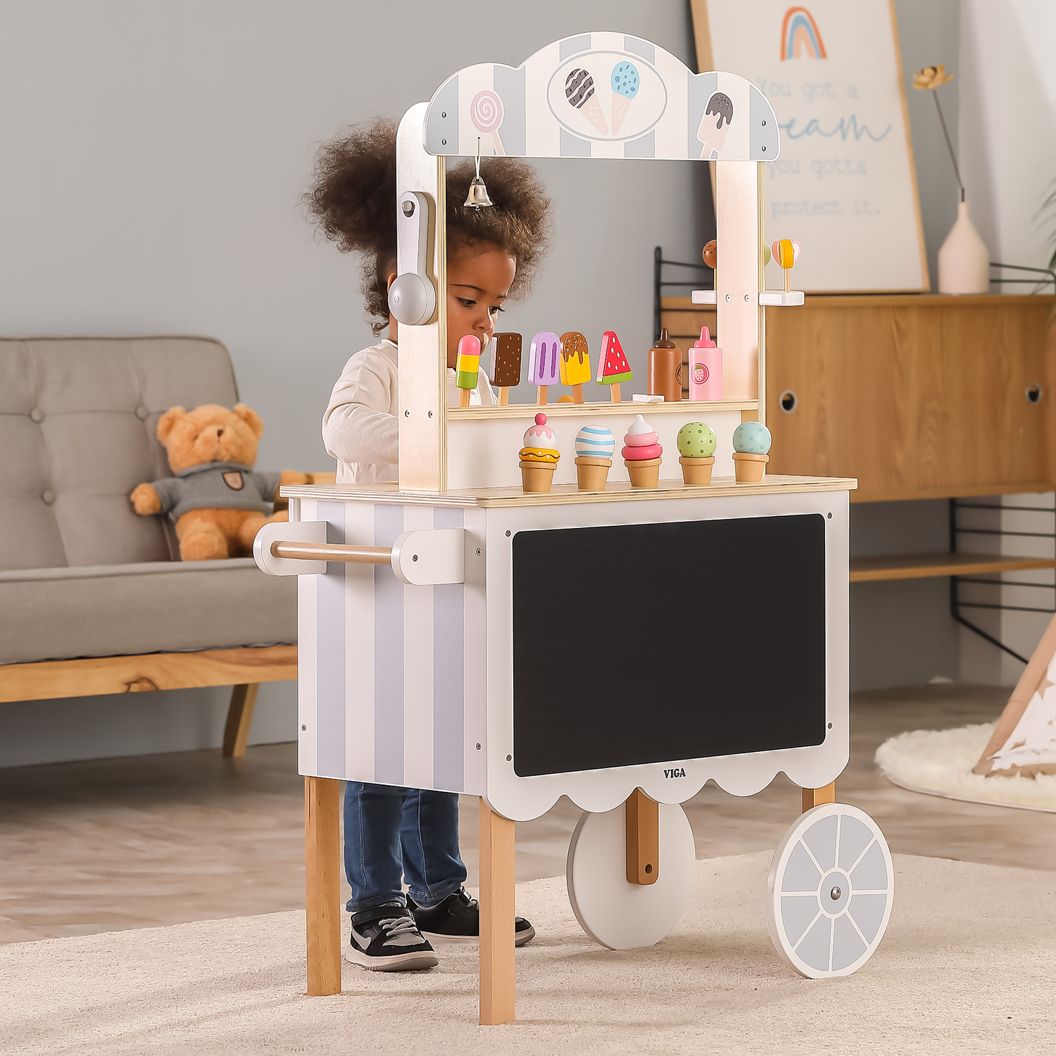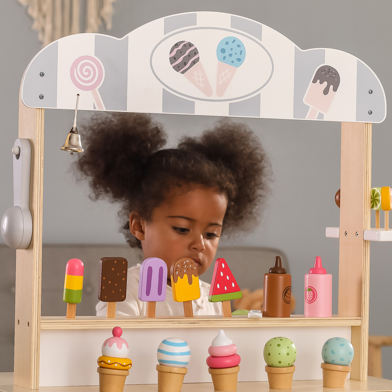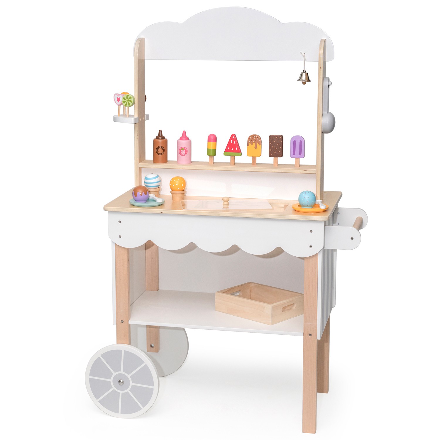 *This ice cream cart toys includes colorful ice cream cones, ice-lollies, lollipops and utensils for a realistic ice-cream trolley experience!