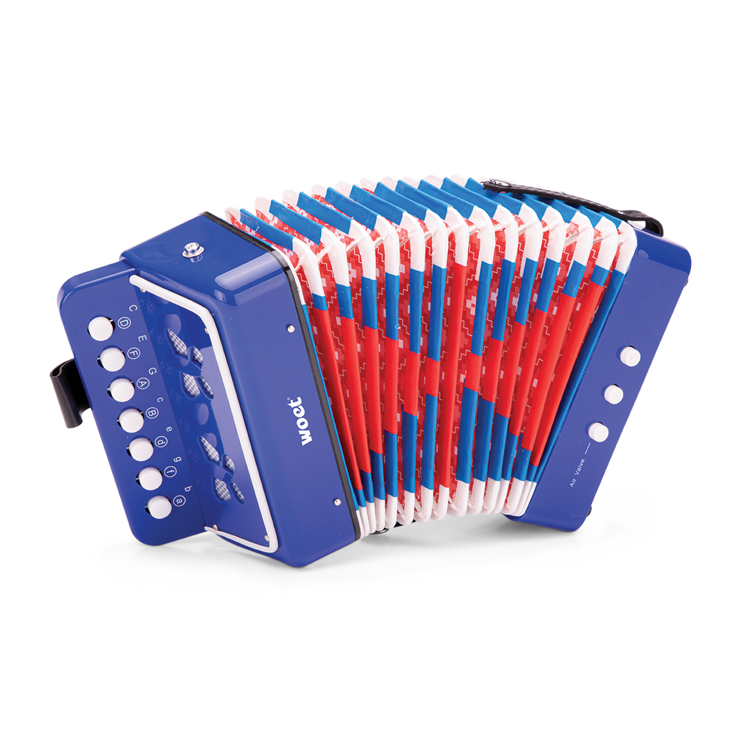 This toy accordion from Woet® is a fantastic way to introduce little ones to the wonderful world of making music. Perfect for encouraging melody makers, or just having fun making lots of noise. This scaled-down toy version of a real accordion features a classic design with a bright and colorful finish. It has two bass buttons, one bass side air button and seven treble in C.