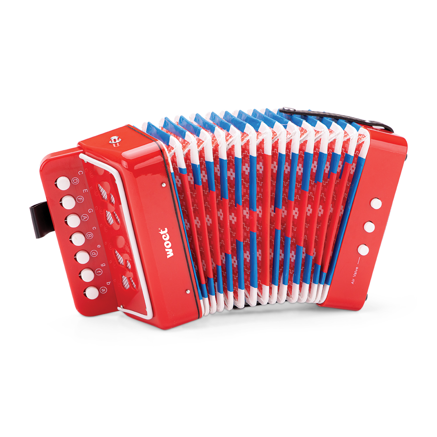 This toy accordion from Woet® is a fantastic way to introduce little ones to the wonderful world of making music. Perfect for encouraging melody makers, or just having fun making lots of noise. This scaled-down toy version of a real accordion features a classic design with a bright and colorful finish. It has two bass buttons, one bass side air button and seven treble in C.