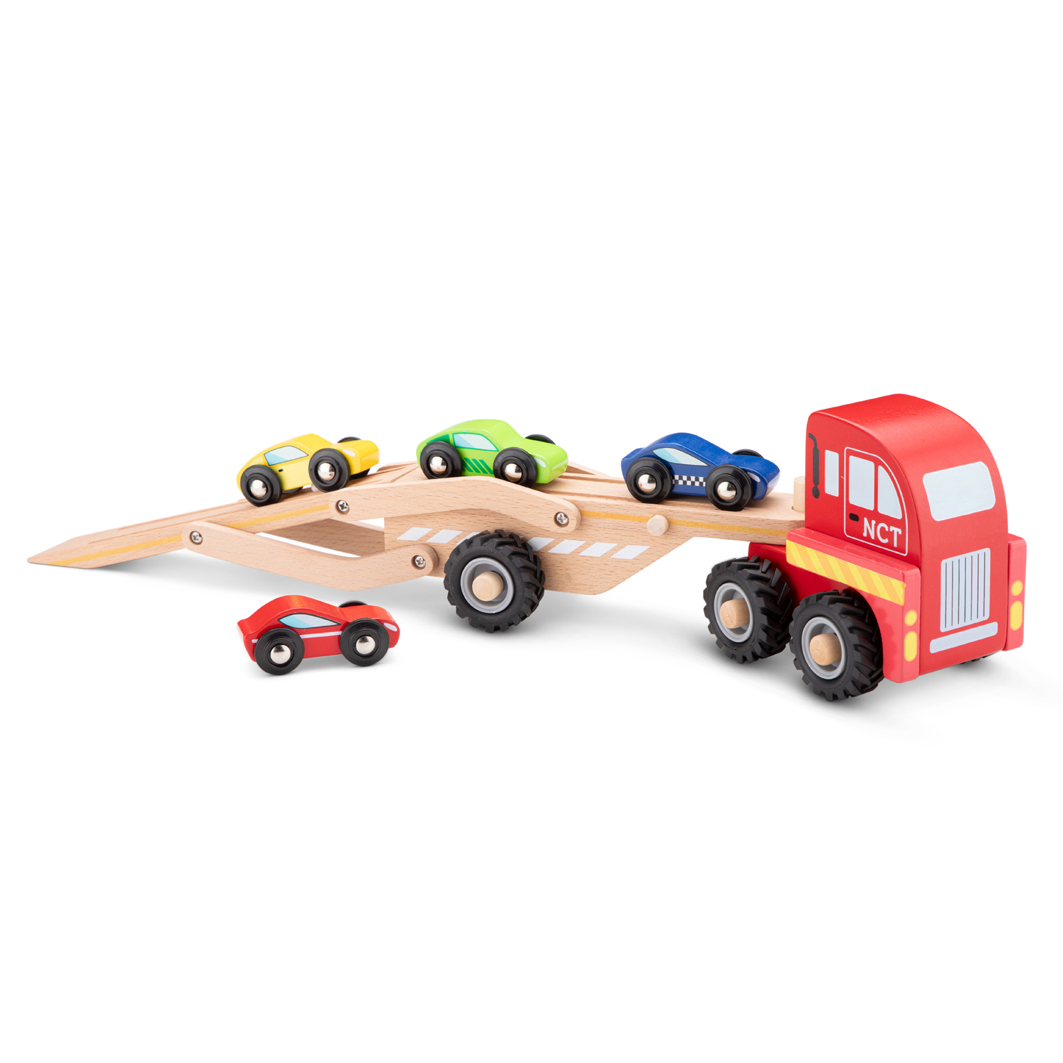 Transport your cars through the whole country with this sturdy Car Transporter with a trailer made of beechwood. The upper level of the trailer can move up and down, making it easy for the cars to drive up and down the trailer. The trailer can be disconnected from the truck. And the car transporter comes including four smaller race cars.